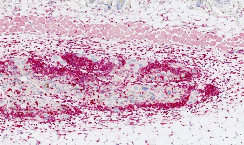 Immune cell infiltrate (in deep red) around senescent cancer cells (large nuclei marked in blue). Credit: IRB Barcelona
