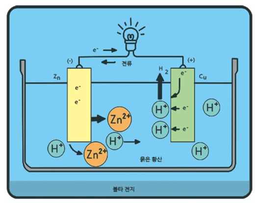 -아연이 산화되어 전자를 내어놓고 전자는 전위차에 의해 구리판으로 이동(반복하여 전류가 흐르게 됨)